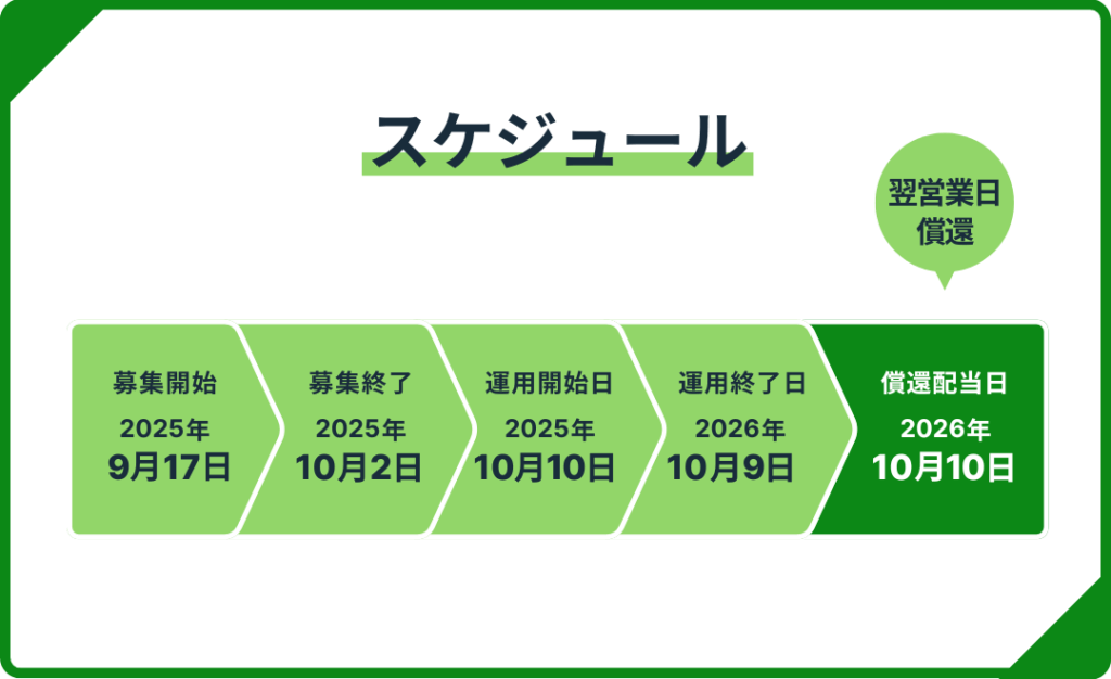 2025年9月にFUNDIで募集された「千葉県芝山町 蓄電池 FUNDIプロジェクト#8」では、こんなスケジュールだったよ。