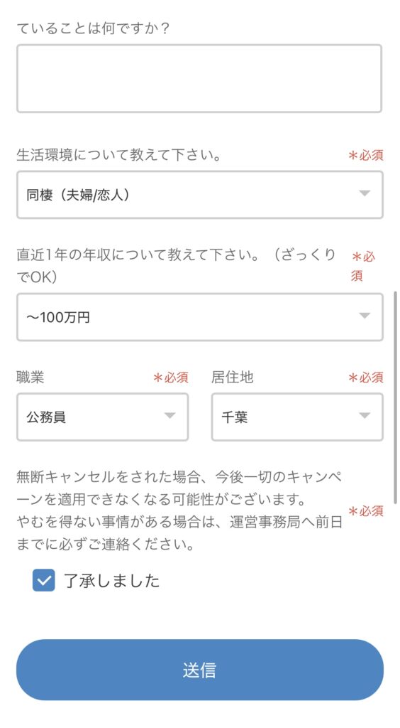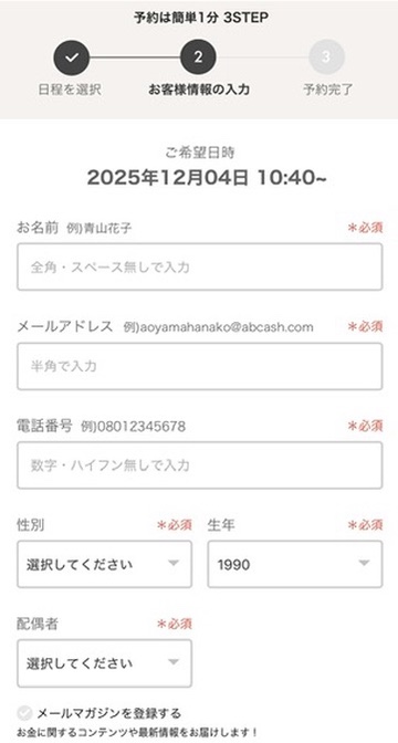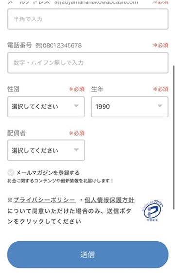 名前メールアドレスなどを入力して送信ボタンを押して完了!